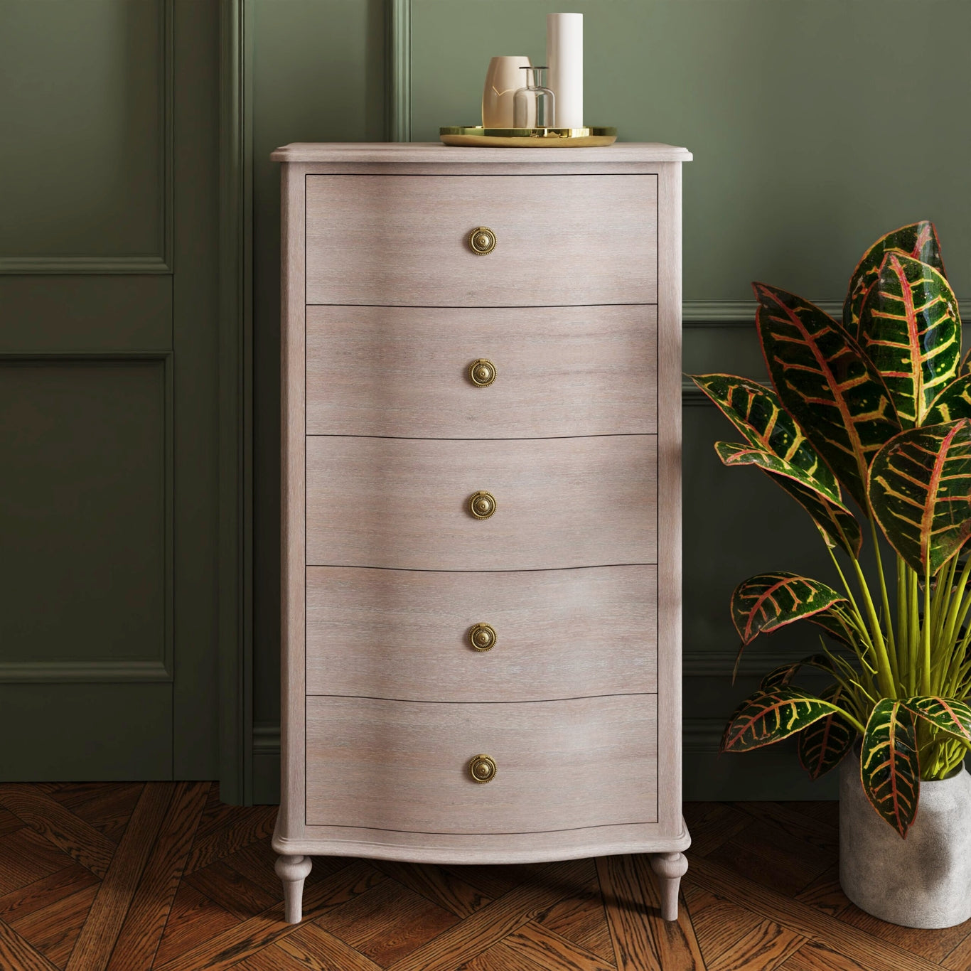 A beautiful five drawer tallboy of superior hardwood quality. This is a very pretty piece made from mahogany wood, finished in an soft white wash veneer finish. The off white finish has warm tones and it's matt, slightly weathered appearance results in a light and airy Skandi feel. Perfect for any living room or bedroom as its neutral finish allows it to blend seamlessly with different color schemes and other furniture styles. A timeless classic storage chest designed to give permanence to your home. Ideal in bedrooms, alcoves and living or hall areas