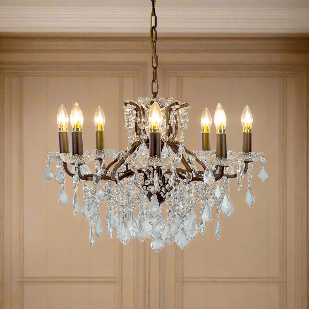 A beautifully detailed eight-arm crystal chandelier with a warm bronze frame and a shallow silhouette designed for homes with standard ceiling heights. Rich in character and sparkle, it brings classic warmth and refined glow to bedrooms, hallways, dining rooms or living spaces. Traditional craftsmanship with a deep, elegant bronze finish.