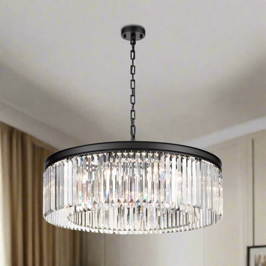 This chandelier brings together a sleek black frame and shimmering prism-cut crystals to create a soft, sparkling glow that instantly warms the room. Its circular design feels modern yet timeless, offering a luxurious focal point without overwhelming the space. Whether styled above a dining table or in a living room, the wide diameter and generous drop make it a confident, eye-catching piece. With its elegant shine and clean silhouette, this chandelier creates a dazzling display of light that instantly becomes the centerpiece of any room.