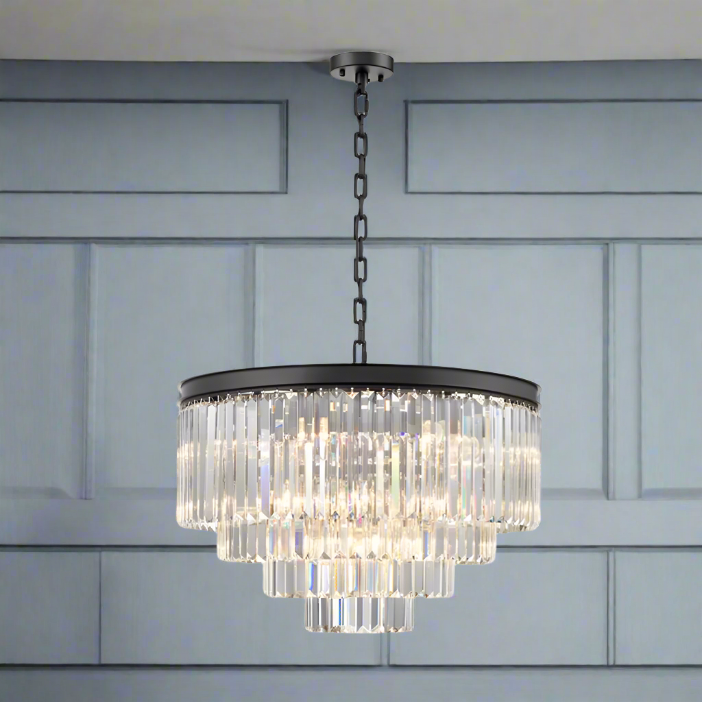 This four-tier chandelier combines a sleek black band with cascading prism-cut crystals, creating a dramatic statement piece with a modern edge. Its layered design reflects the light beautifully, giving the room a warm, inviting sparkle. At 65 cm wide, it’s substantial without feeling overbearing - perfect for homes that want a touch of luxury with contemporary character. Whether styled above a dining table or in an open kitchen-diner, it transforms the space instantly.