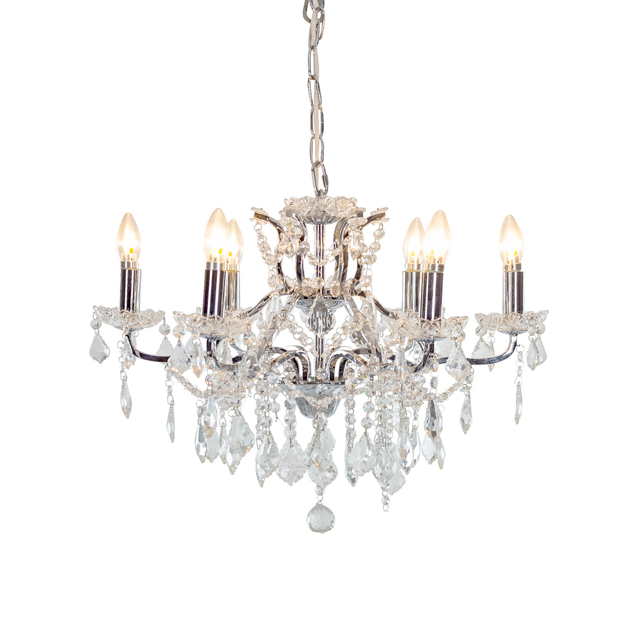 A beautifully crafted shallow crystal chandelier with six branches and a polished chrome frame. Designed for rooms without high ceilings, it offers generous sparkle and presence without overwhelming the space. Its combination of classic crystal forms and contemporary chrome detailing makes it equally suited to modern and transitional interiors.