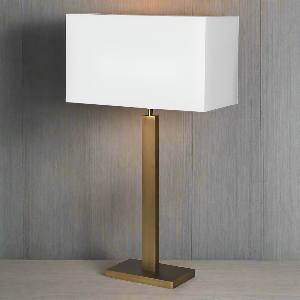 A luxurious looking tall gilt metal lamp with rectangular white shade with a gold lining adding to the overall warm gold glow of the entire piece. A total stylish statement lamp. Table lamps are the perfect way to add ambient lighting to any interior and the warmth of a filament bulb glowing through this rectangular shade is a great example.