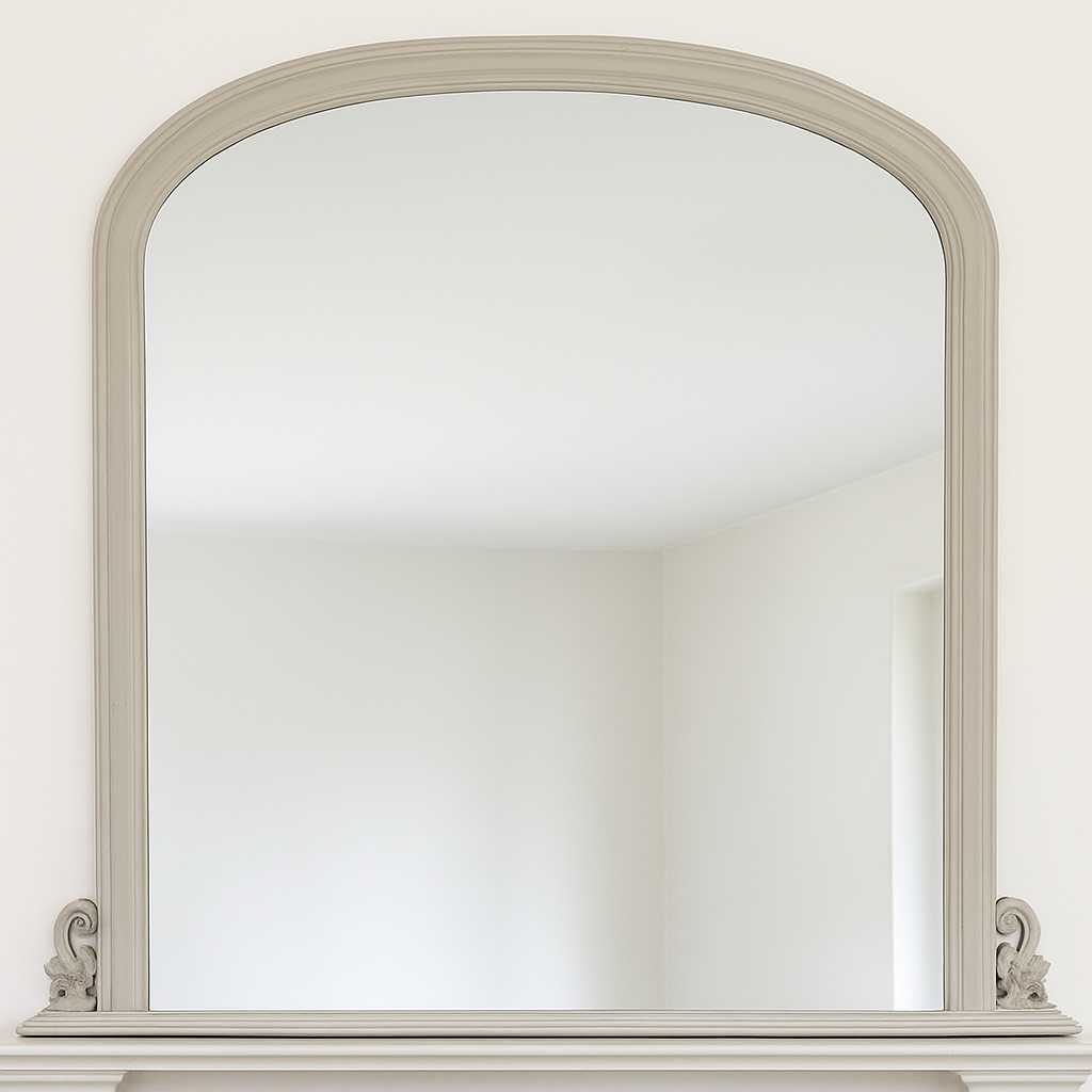 This classic mirror features a soft, curved top and refined scroll work at the base, adding a touch of sophistication to any living room, hallway, or bedroom. The frame is hand-finished in a soft neutral paint that complements both traditional and contemporary décor. The generously sized mirror reflects natural light to enhance the sense of space in your home, while the architectural arch draws the eye upward, adding height and balance to your mantelpiece.