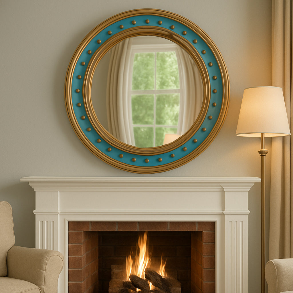 The convex mirror at the center creates a unique, slightly distorted reflection, enhancing light and making the piece both functional and decorative. Its design draws inspiration from Regency and neoclassical styles, often associated with “bullseye” or “sailor’s mirrors,” but the vibrant blue adds a contemporary twist.
