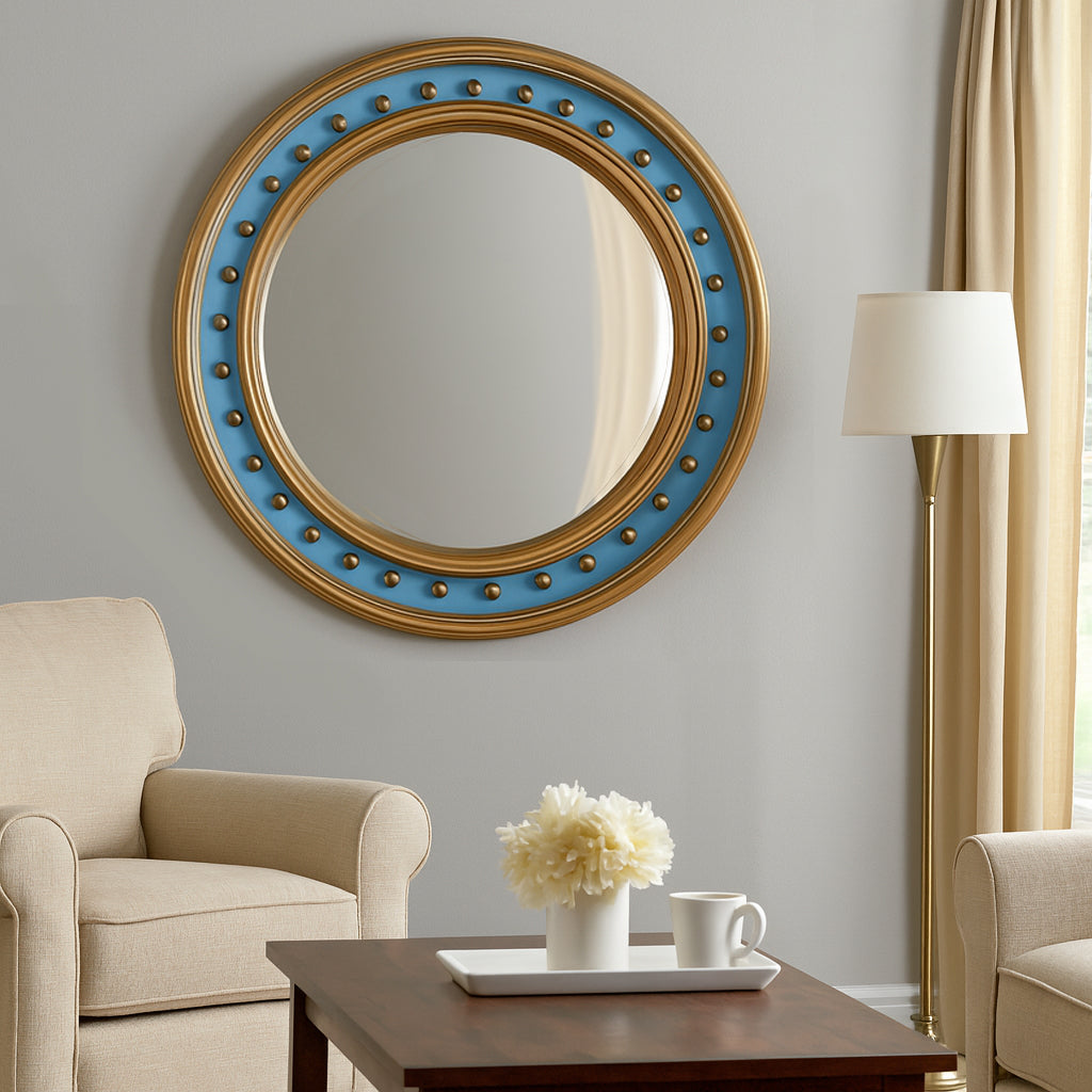 This is a striking blue and gold convex mirror designed in a bold, decorative style. The frame is circular and finished in a rich gilt gold, with a prominent inner band in a vivid turquoise blue. Around the blue section, evenly spaced gilded ball ornaments add depth and texture, giving the piece a distinctive and playful yet elegant character.