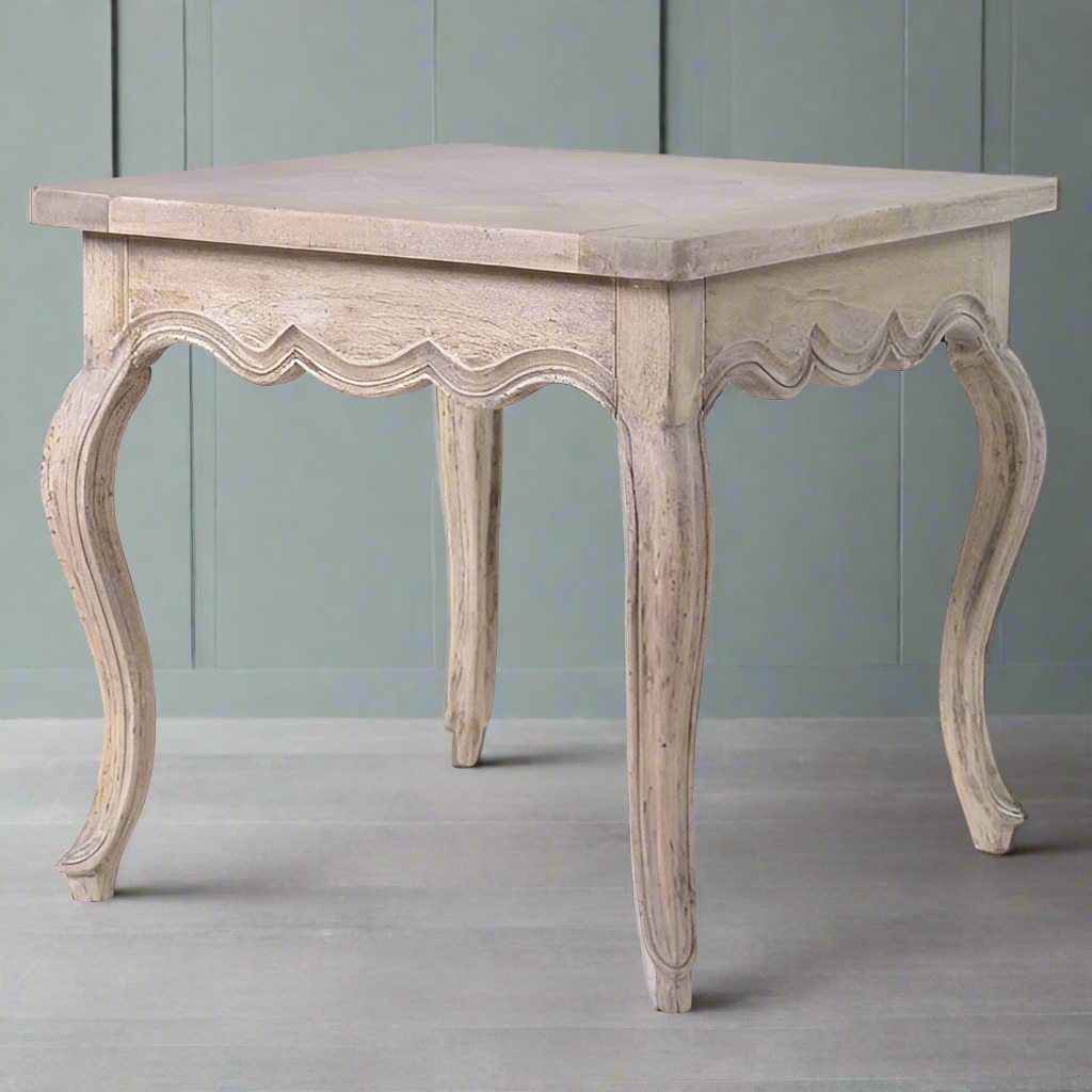 Pale acacia wood side table with vintage style curved legs, curved frieze edge and a parquet top. An unusually decorative table, in a pale colour with vintage flourishes. Classic wooden side table, perfect for a country house or traditional period house. Great sofa side tables, a good size, plenty or room for all your books, lights etc.