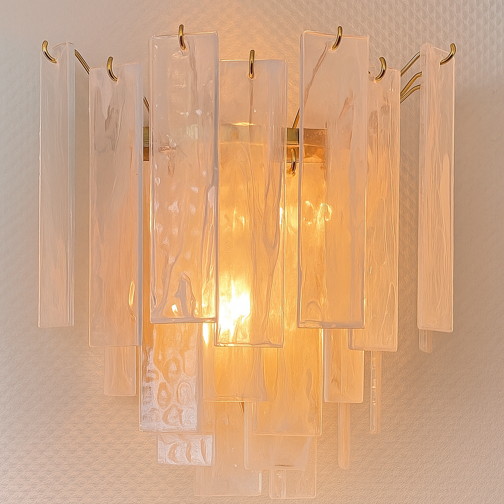 This luxurious wall light features cascading crystal ribbon panels delicately suspended from a gilt metal frame. Each translucent panel captures and diffuses the warm glow of the bulb within, creating a sophisticated lighting statement perfect for elegant interiors.