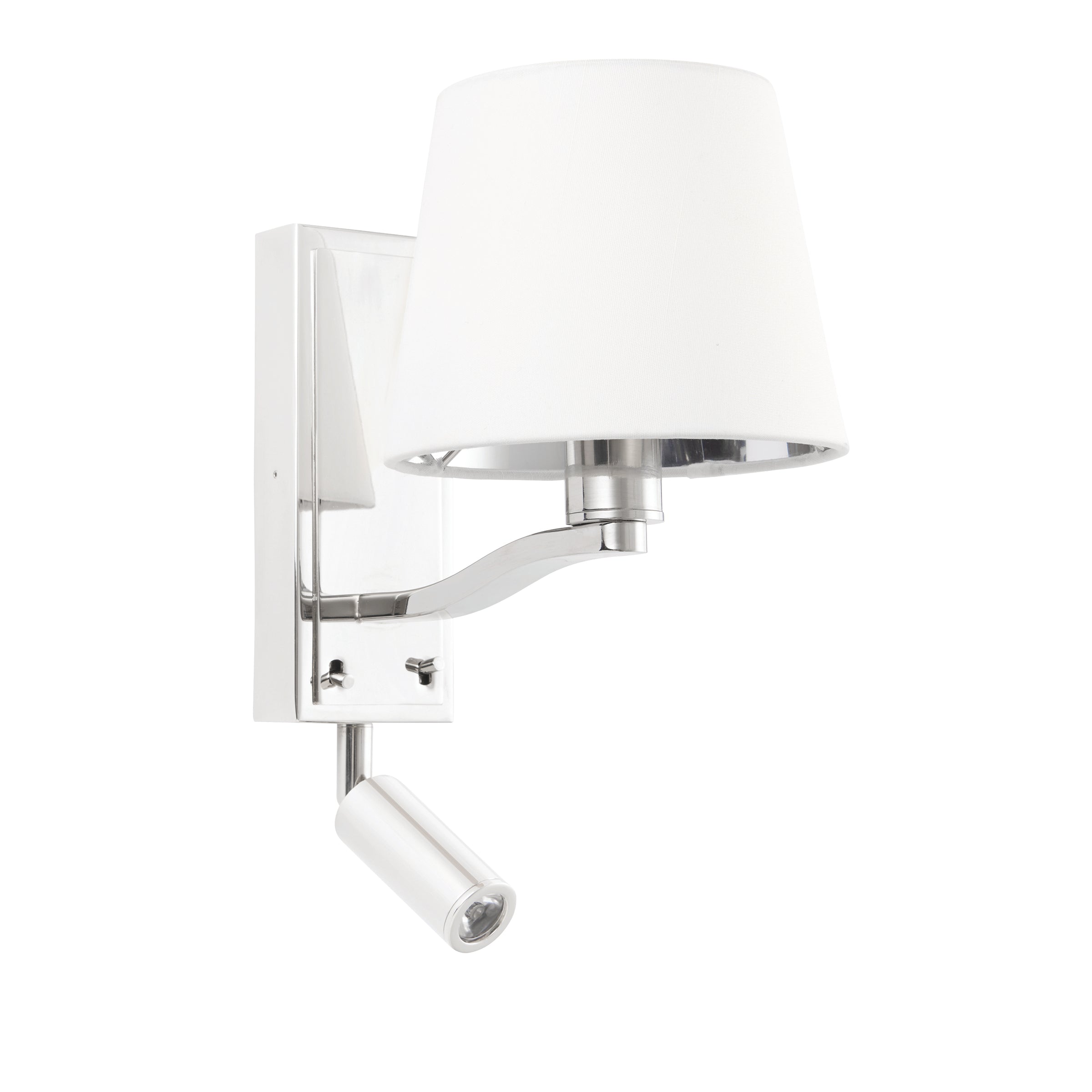 Nickel plated wall light with a white vintage faux silk shade. This light has an adjustable LED light attached for extra light. Suitable as bedside wall lights. Great in a living room with the added benefit of reading by the LED light.