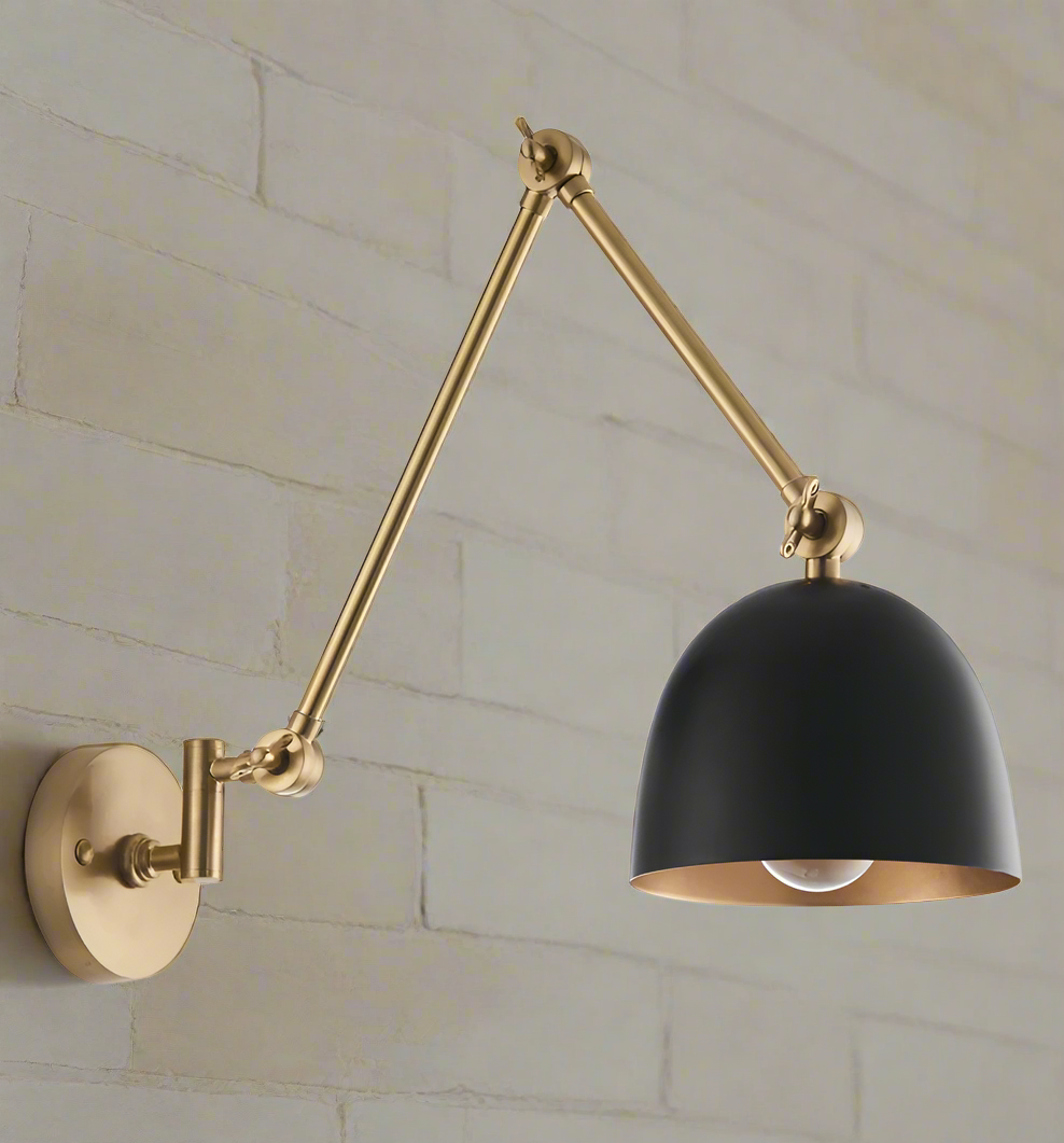 Gold flexible armed wall light with black shade. Industrial style wall light with extended arm. The perfect design, with fully adjustable arms, position either side of your bed or as a task light above a kitchen work top.