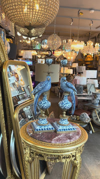 Each parrot features a beautifully detailed blue and white porcelain body perched on an ornate gilt bronze base, set upon an elegant plinth. Simply place your wax candles into the bronze and porcelain cups to create a warm, luxurious glow.